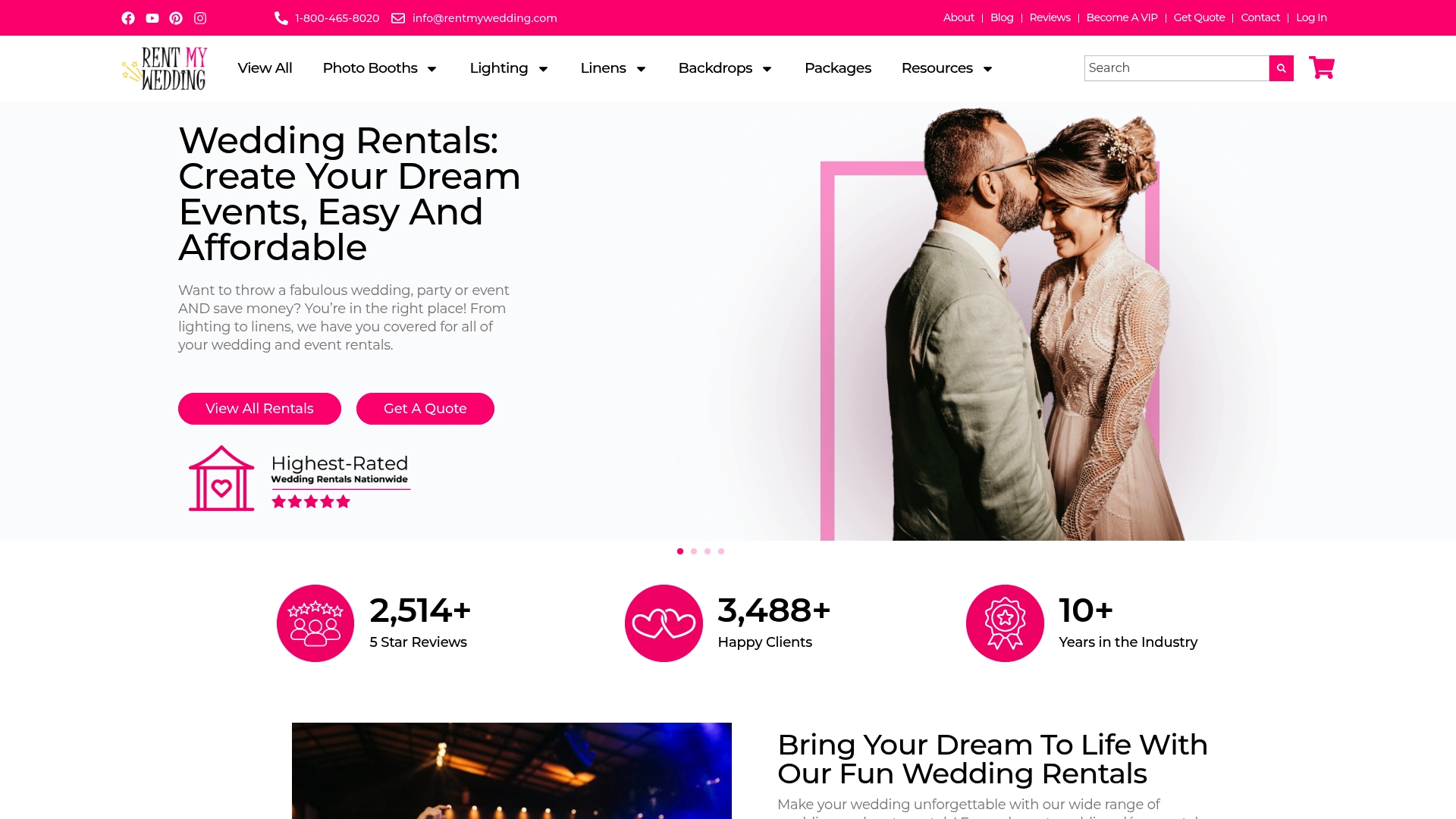 The platform provides a wide range of wedding and event rentals including lighting, linens, backdrops, photo booths, canopies and more, all searchable through an online catalogue. Personalised monogram lighting and customisable backdrops add creative options for ceremony and reception styling.