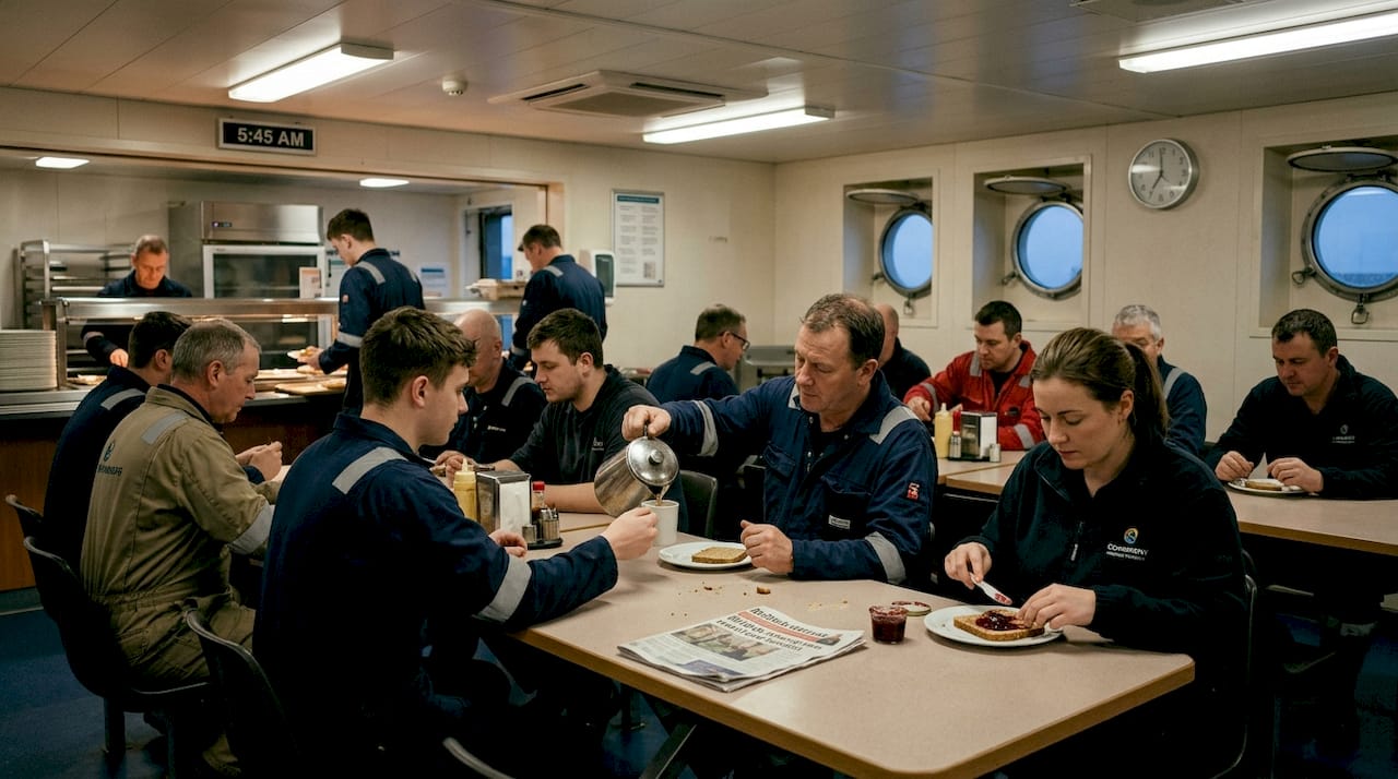 A standard offshore day begins around 05:30 to 06:00. You eat breakfast, attend a safety briefing, and start your 12-hour shift. Meals are provided throughout the day, and the galley (the onboard kitchen and dining area) is typically open around the clock. After your shift ends, you have time to shower, eat again, use the gym, watch television, or connect to the internet before lights out around 22:00.
